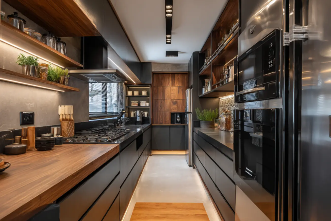 A chave aqui é o planejamento vertical e a escolha de elementos que maximizem cada centímetro. Prateleiras abertas, armários altos e soluções inteligentes para embutir eletrodomésticos transformam um corredor em um espaço gourmet totalmente equipado e estiloso. Você já viu algo assim em ação? É impressionante!