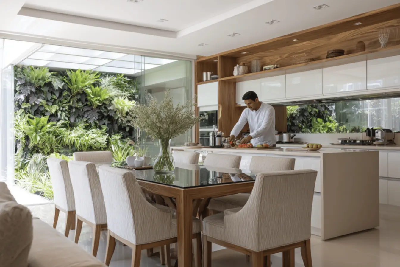 Quando pensamos em ambientes integrados bem planejados, a imagem que nos vem à mente é de fluidez e amplitude. É possível criar diferentes atmosferas dentro de um mesmo espaço, como a energia vibrante da cozinha se conectando à tranquilidade da sala de estar e ao calor convidativo da área de jantar. Tudo isso, sem perder a identidade de cada canto, mas ganhando em luminosidade e sensação de espaço.