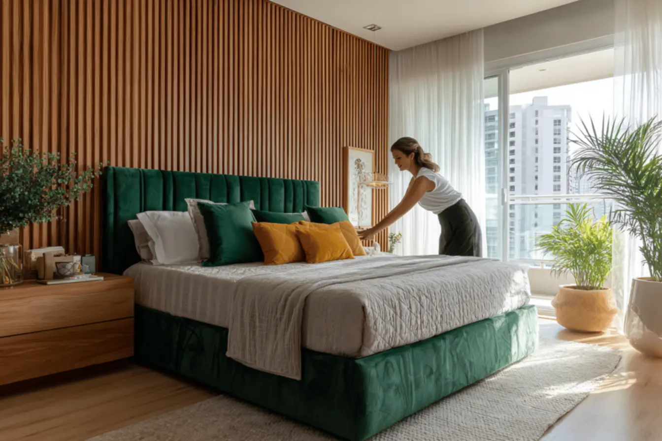Ah, o tecido! Aqui reside grande parte da “magia” que faz sua cabeceira parecer cara. Linho, veludo, suede, sarja de algodão… cada um tem um charme. Veludos trazem luxo e um toque sedoso. Linho confere elegância natural e atemporalidade. Suede e sarja são práticos e muito versáteis. Escolha cores que harmonizem com o seu quarto, ou ouse com um tom vibrante para criar um ponto focal. Lembre-se de calcular o tecido com uma boa sobra para o grampeamento, geralmente uns 15-20 cm de cada lado da placa. Para inspirações sobre como escolher os elementos que compõem um ambiente moderno, confira também nossas tendências em revestimentos para 2026.