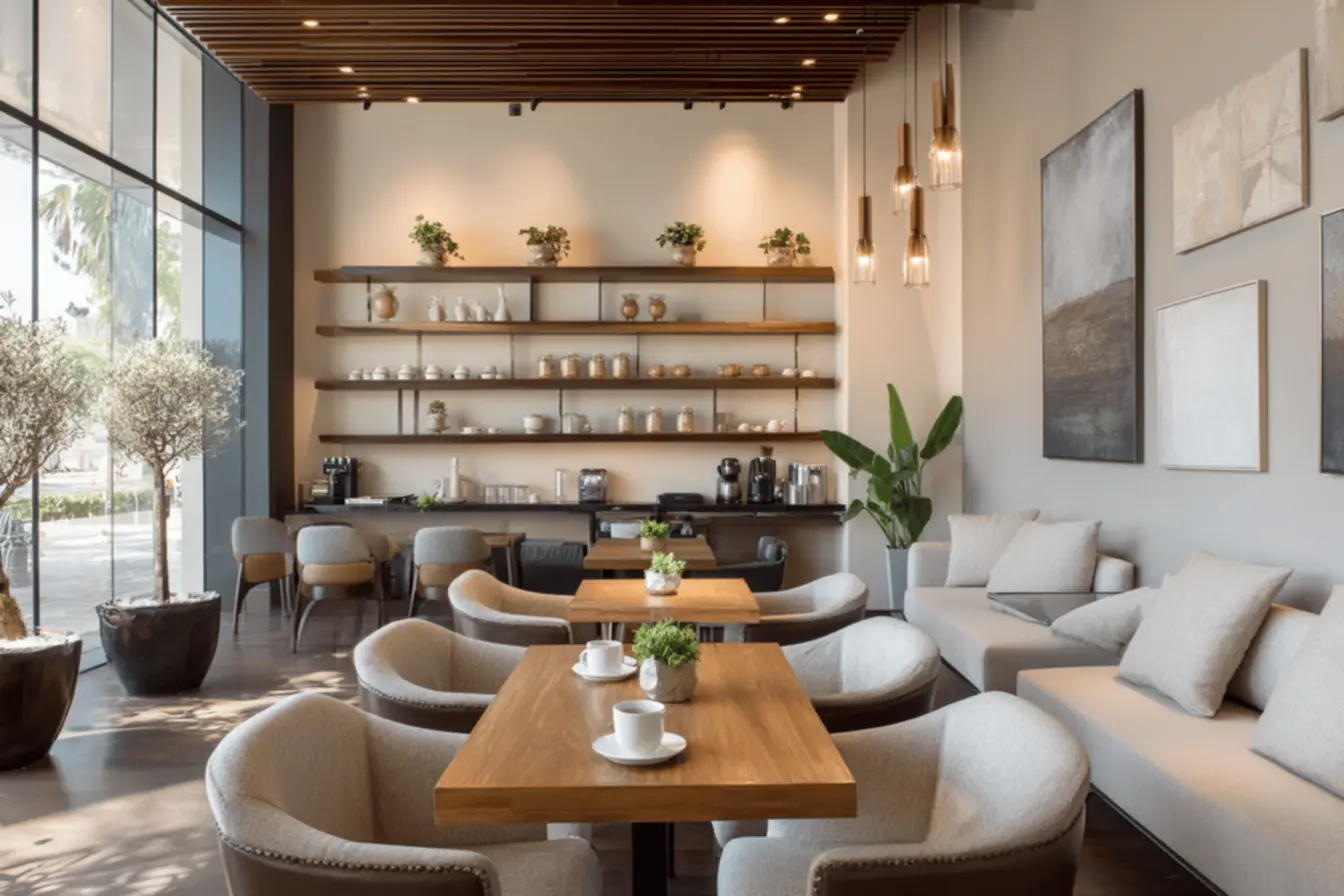 - Paredes: Pense em quadros artísticos ou murais temáticos de café que adicionem um toque de charme e inspiração.