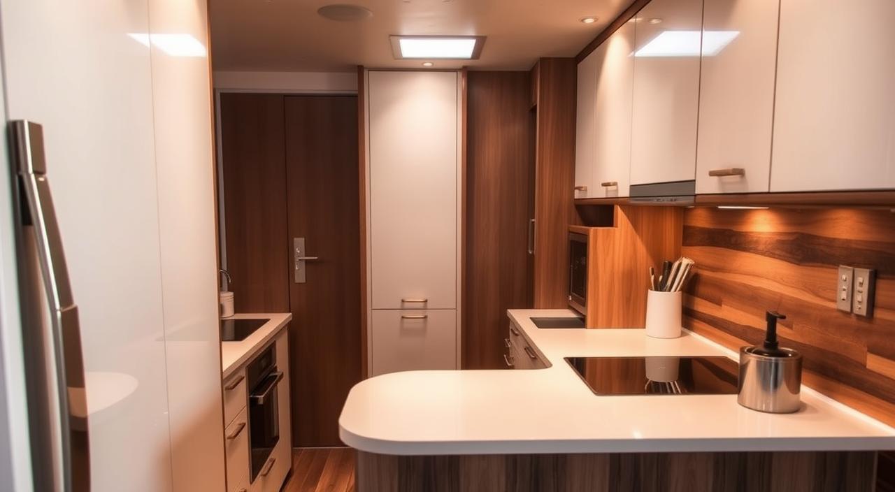 Pense em uma bancada que se estende e vira uma mesa de refeições rápida, ou armários que escondem eletrodomésticos, mantendo a superfície livre e organizada. Ou ainda, nichos que se abrem para revelar um cantinho para o café. São essas soluções que transformam completamente a percepção e o uso do espaço.