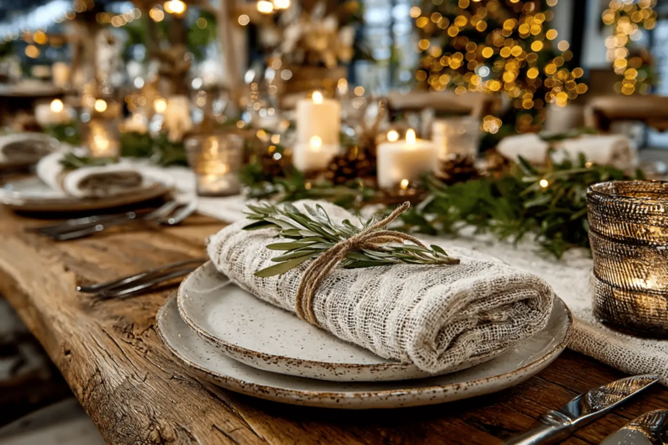 Adicione um toque especial com guardanapos de tecido amarrados com um raminho de alecrim ou um pequeno galho de pinheiro. Velas finas em castiçais discretos e um centro de mesa com pinhas ou um arranjo floral singelo completam a composição, criando um ambiente convidativo e elegante para compartilhar momentos preciosos.