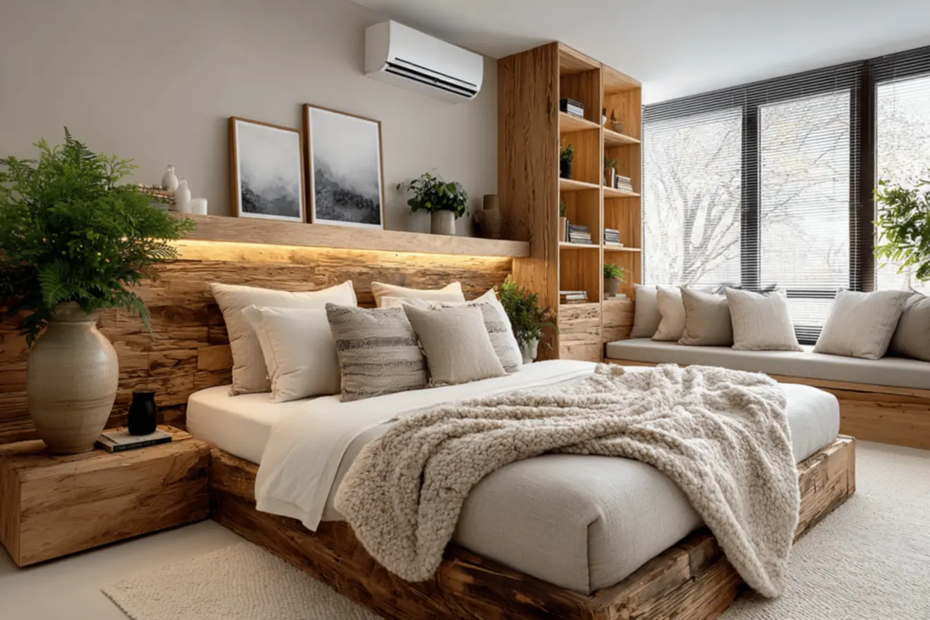 Pode ser um painel de madeira com recortes estratégicos ou uma estrutura de alvenaria. Essa ideia une praticidade e design de forma inteligente, mantendo o quarto organizado e visualmente limpo. É uma das ideias criativas para cabeceira de cama mais funcionais que conheço.