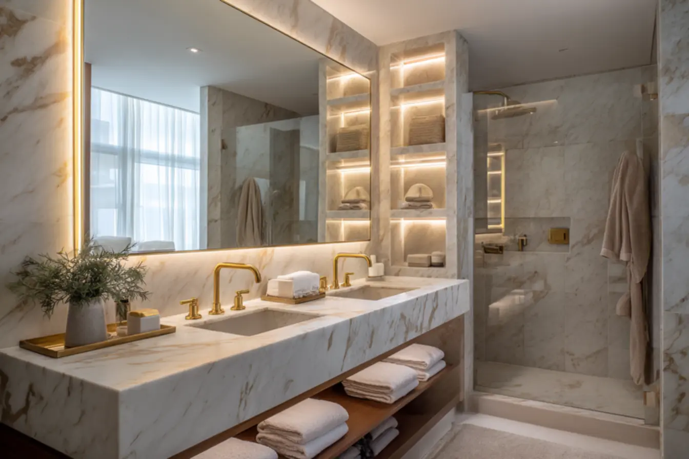 A iluminação é essencial nos nichos de banheiro. Luzes embutidas ao redor do nicho proporcionam uma iluminação suave e agradável. Para um toque de luxo, o mármore é uma excelente escolha, mas é importante selar para garantir a durabilidade.