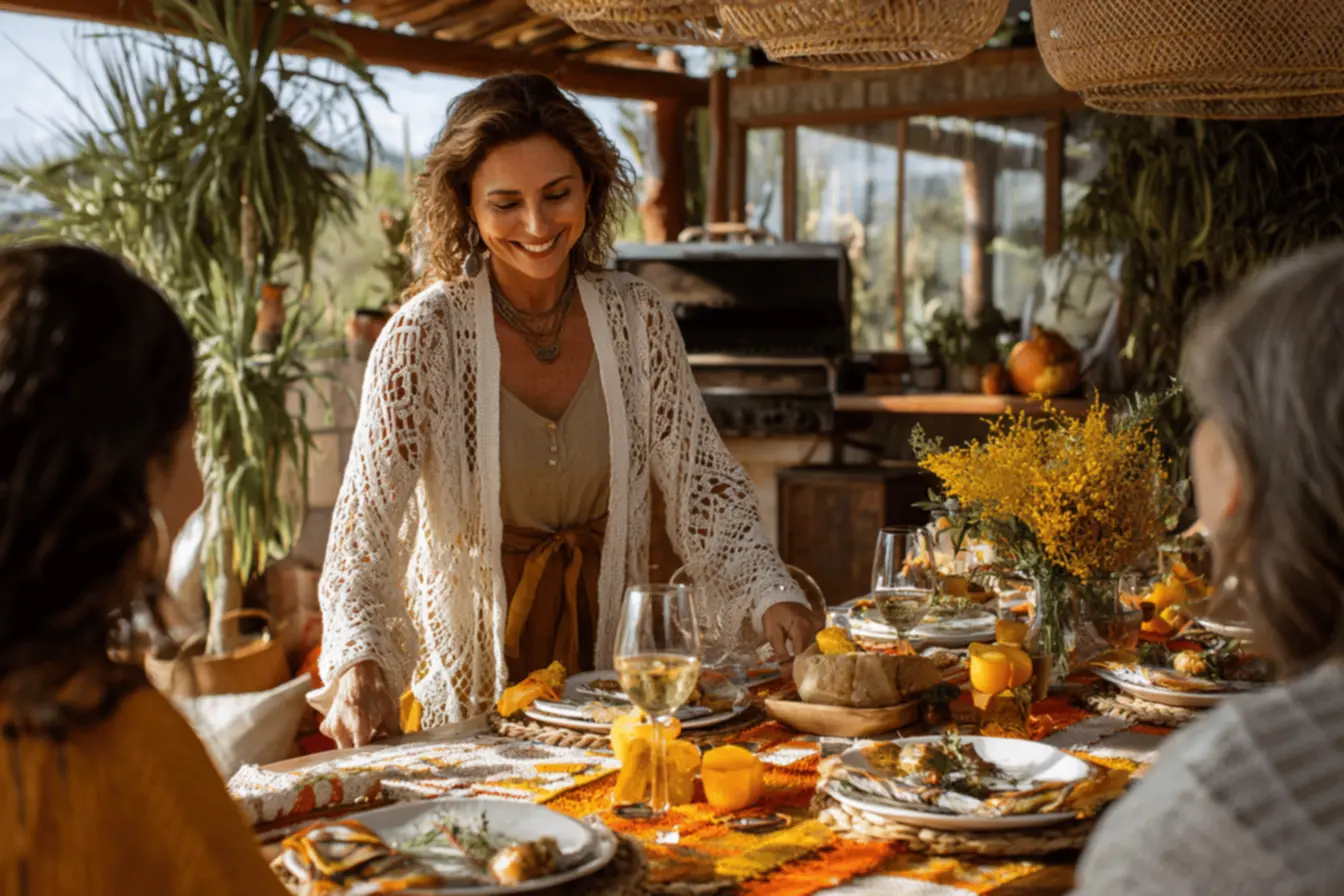 Para um brunch descontraído com amigos, escolho peças mais leves, talvez com elementos de crochê ou contas coloridas, que remetam à leveza e alegria. Já para um jantar de Natal, por exemplo, não abro mão dos tons de vermelho, verde ou dourado, com folhagens e pinhas, criando um ambiente festivo e mágico.
